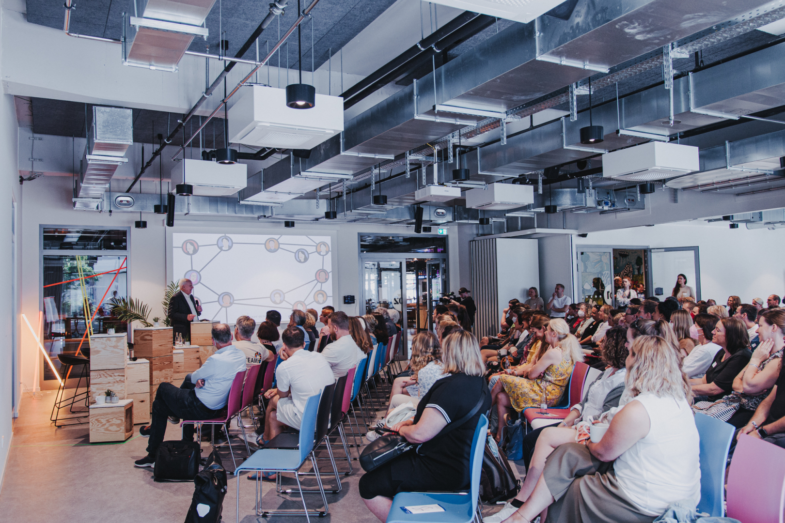 Sie besteht aus sieben Ständen mit internationalem Streetfood, einem Café und einer Bar. Die Tribüne im Herzen der Markthalle ist ideal für Präsentationen, Stand-Up-Pitches, Film- und Konzertabende. Im Erdgeschoss befinden sich zudem drei große, flexible Eventräume, die für öffentliche und interne Veranstaltungen gemietet werden können. Auch im Coworking-Bereich der 1. Etage herrscht eine inspirierende Umgebung mit modernster Ausstattung. Neben flexiblen und festen Arbeitsplätzen im Openspace, gibt es hier eine Auswahl an Meetingräumen und Büros. CORE ist und bleibt ein agiler, bunter Ort. Denn durch gegenseitige Inspiration und interdisziplinären Austausch entstehen innovative Projekte und Kollaborationen – entscheidende Faktoren, die für die positive Gestaltung der Zukunft benötigt werden.